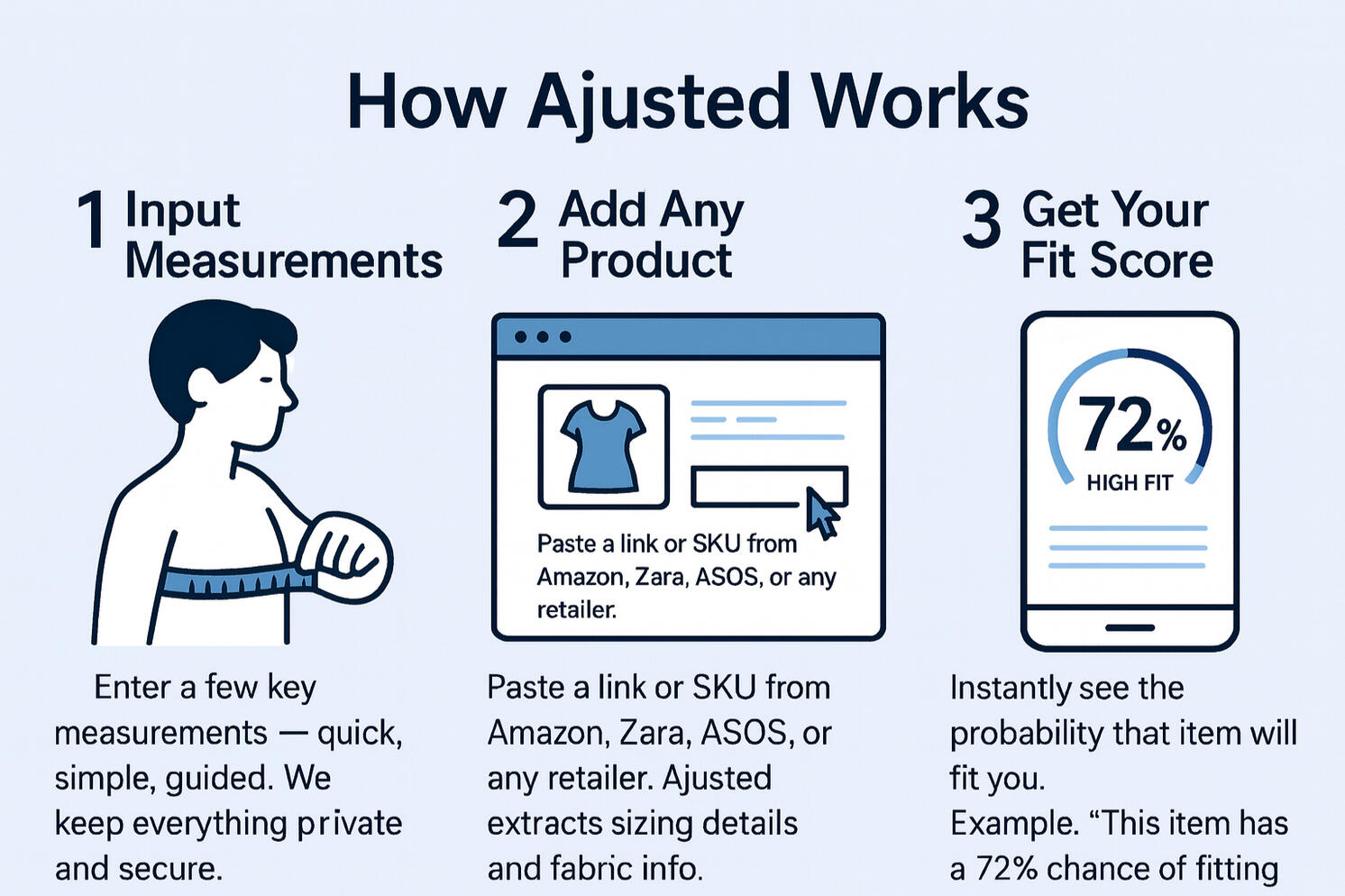 Why We Built ThisReturning clothes can be draining. Around 70% of online clothing returns are due to poor fit.Existing tools need complicated body scans or only work on one site.Ajusted is different — simple measurements, works everywhere.