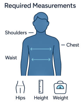 Required measurements (quick & simple): chest, shoulder width,waist, hips, height, weight.